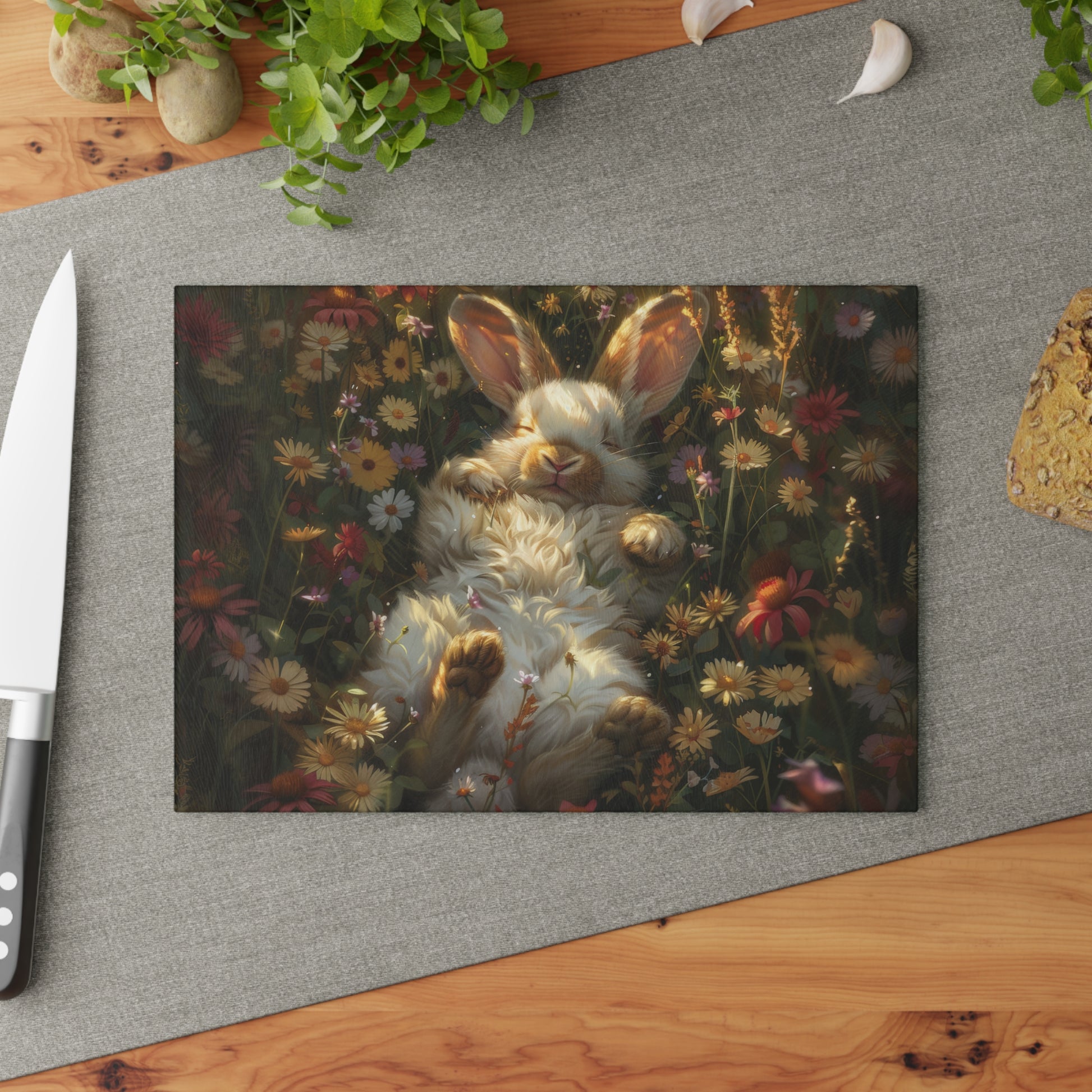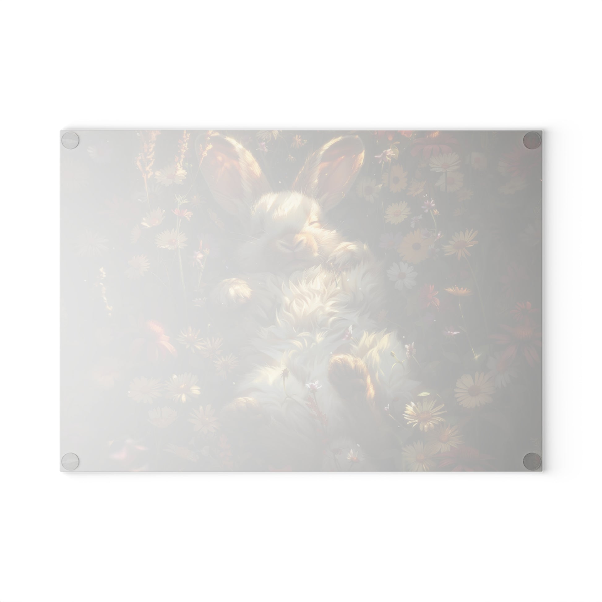 Add a touch of whimsy and warmth to your kitchen with the Bunny in the Meadow Glass Cutting Board. This enchanting design features an adorable, fluffy bunny lounging in a field of colorful wildflowers, evoking feelings of tranquility, joy, and connection to nature. The vibrant imagery and soft, dreamy atmosphere make this cutting board a delightful addition to any kitchen space.