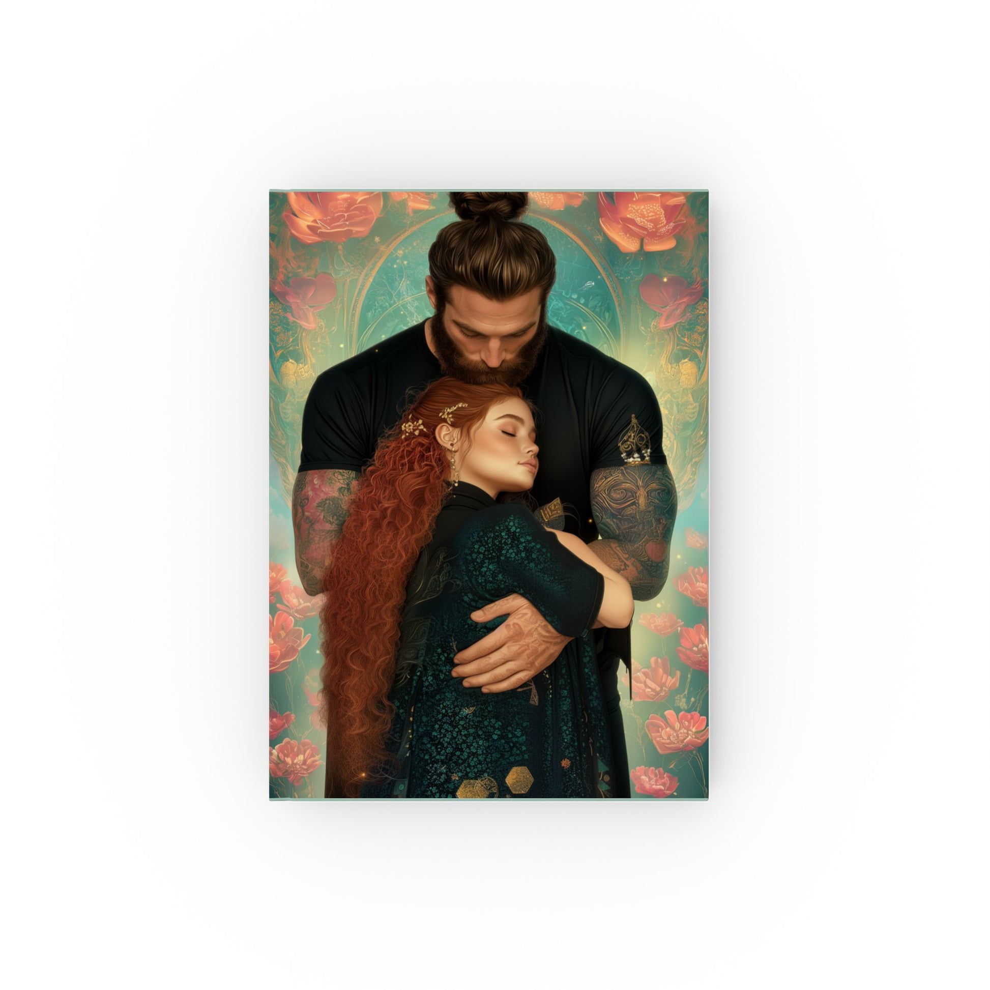 Unveil your thoughts within the Enchanted Embrace Journal, where every page captures the warmth and magic of a timeless connection. This beautifully crafted journal cover depicts an intimate moment of devotion, with a strong yet gentle figure enveloping a serene soul in a tender embrace, surrounded by soft floral accents and mystical patterns. Perfect for journaling dreams, intentions, or everyday musings, this design invites you to feel supported and inspired with each word you pen. Let this enchanting cover remind you that love and comfort are always near, as you journey through your inner world.