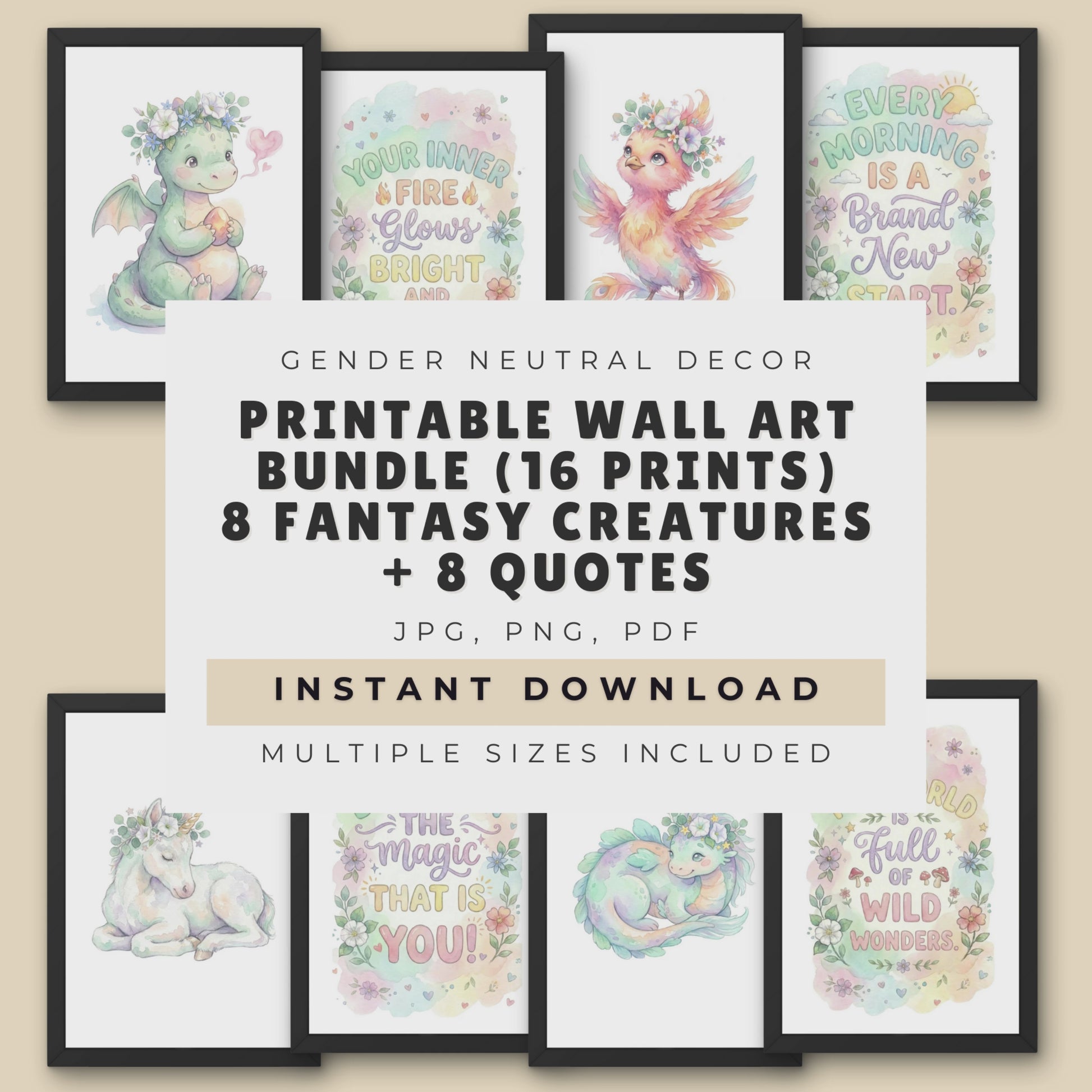 Printable Nursery Wall Art Bundle (16 Prints), Pastel Fantasy Creatures + Quotes, Instant Download