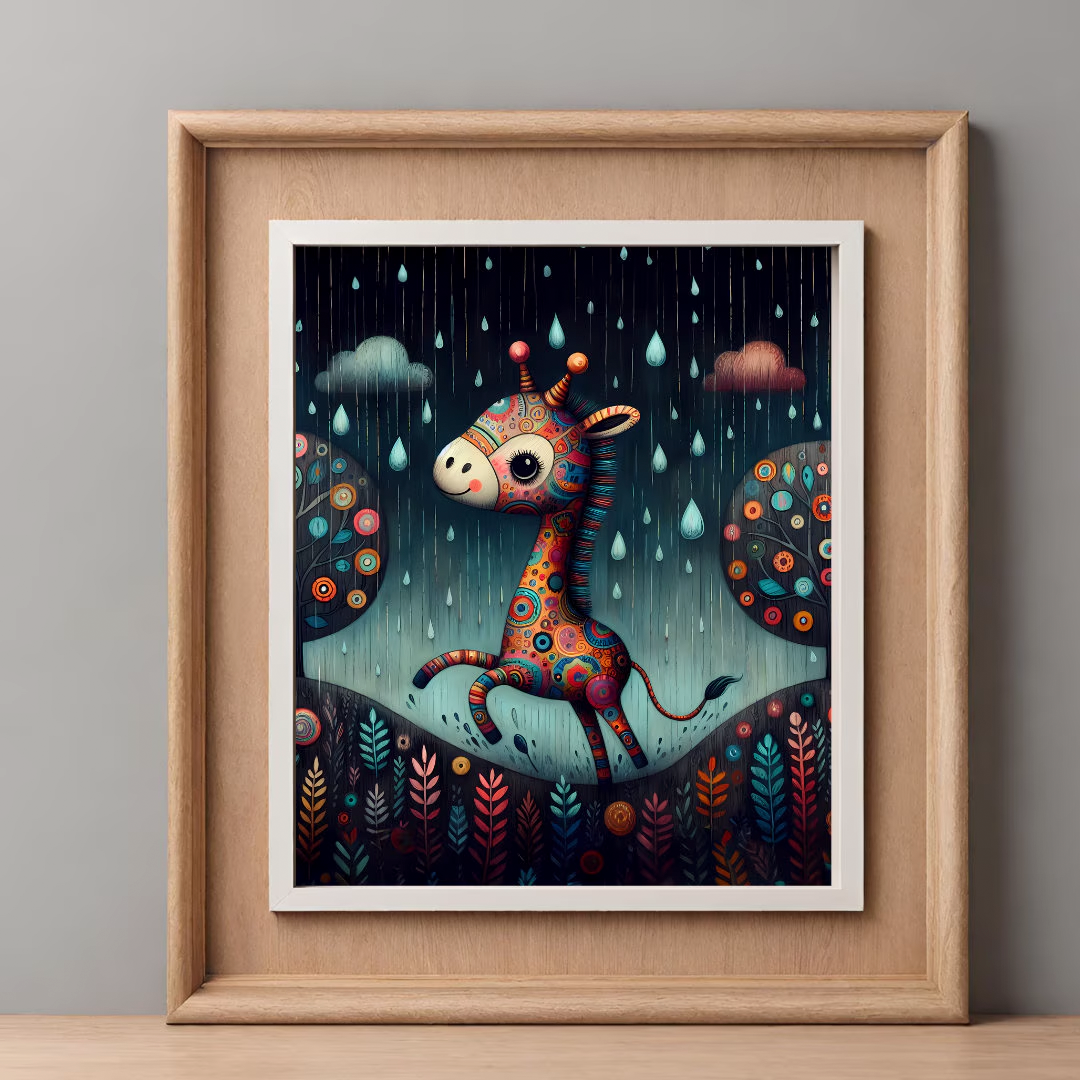 Immerse yourself in the melodic embrace of 'Raindrop Rhapsody', a captivating collection of digital art prints that orchestrates a symphony of color, charm, and whimsy. Each piece in this series depicts an animal character, artfully rendered with a harmonious blend of intricate patterns and vibrant hues, all