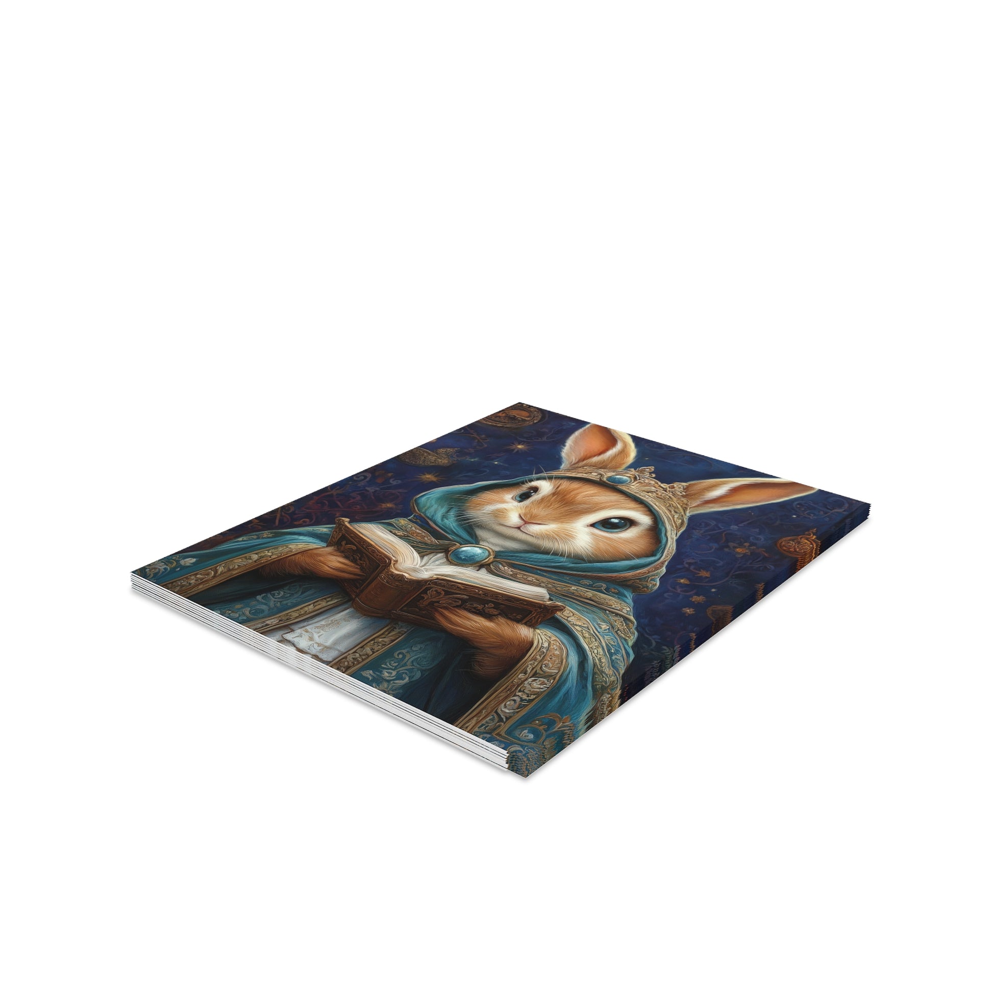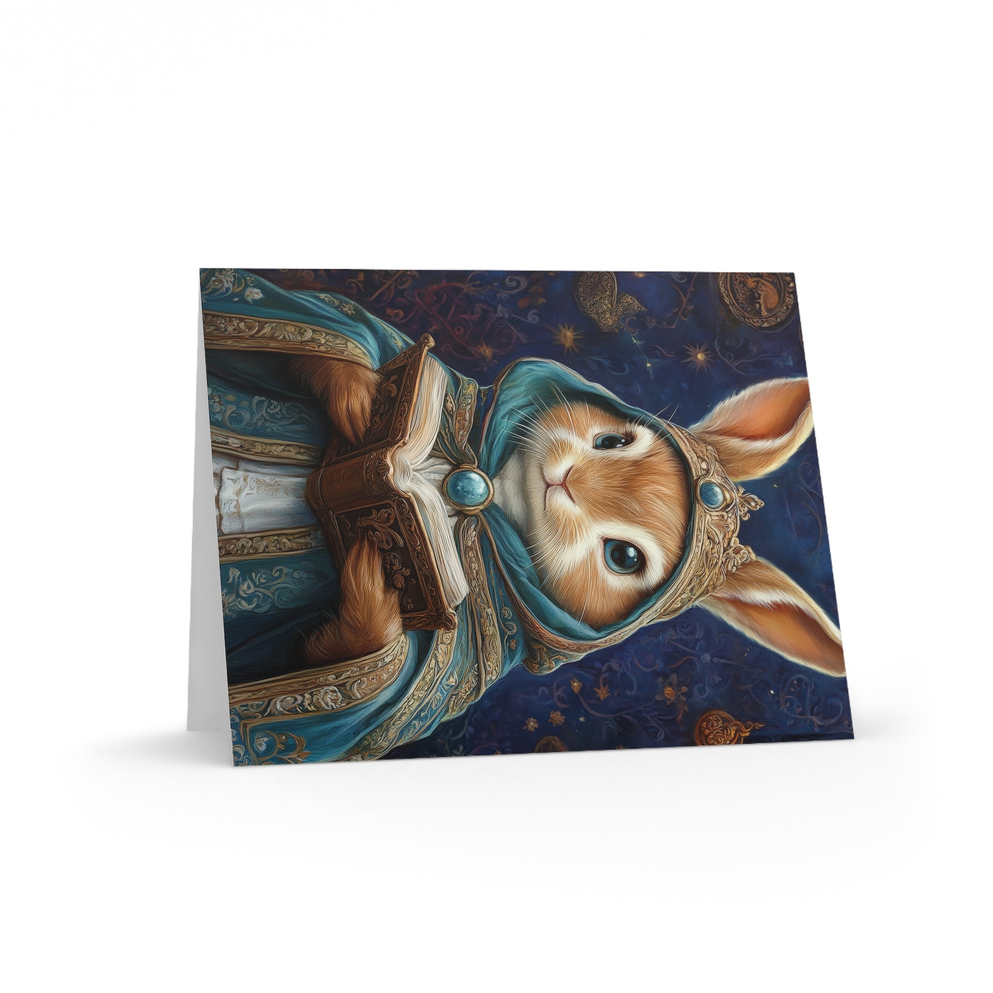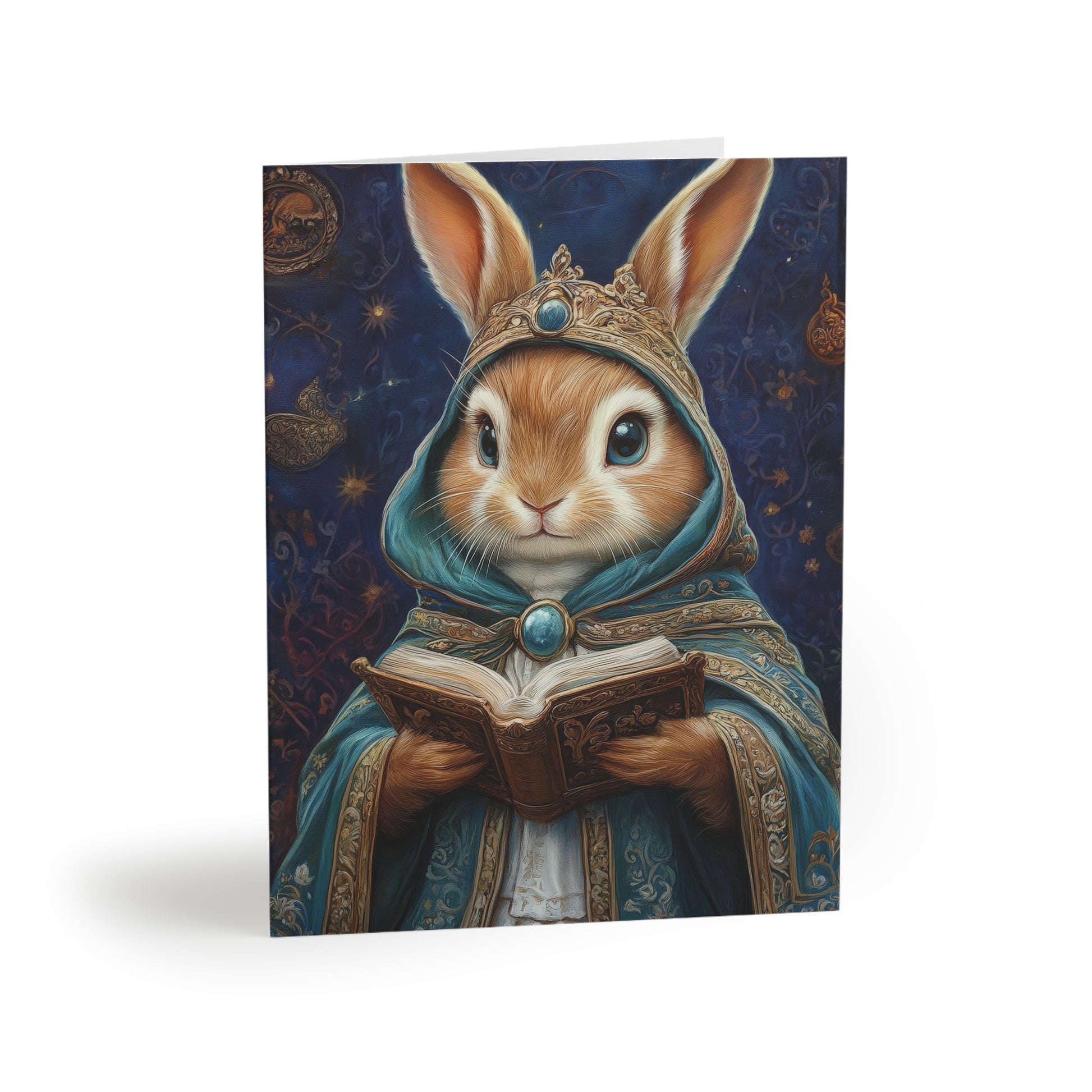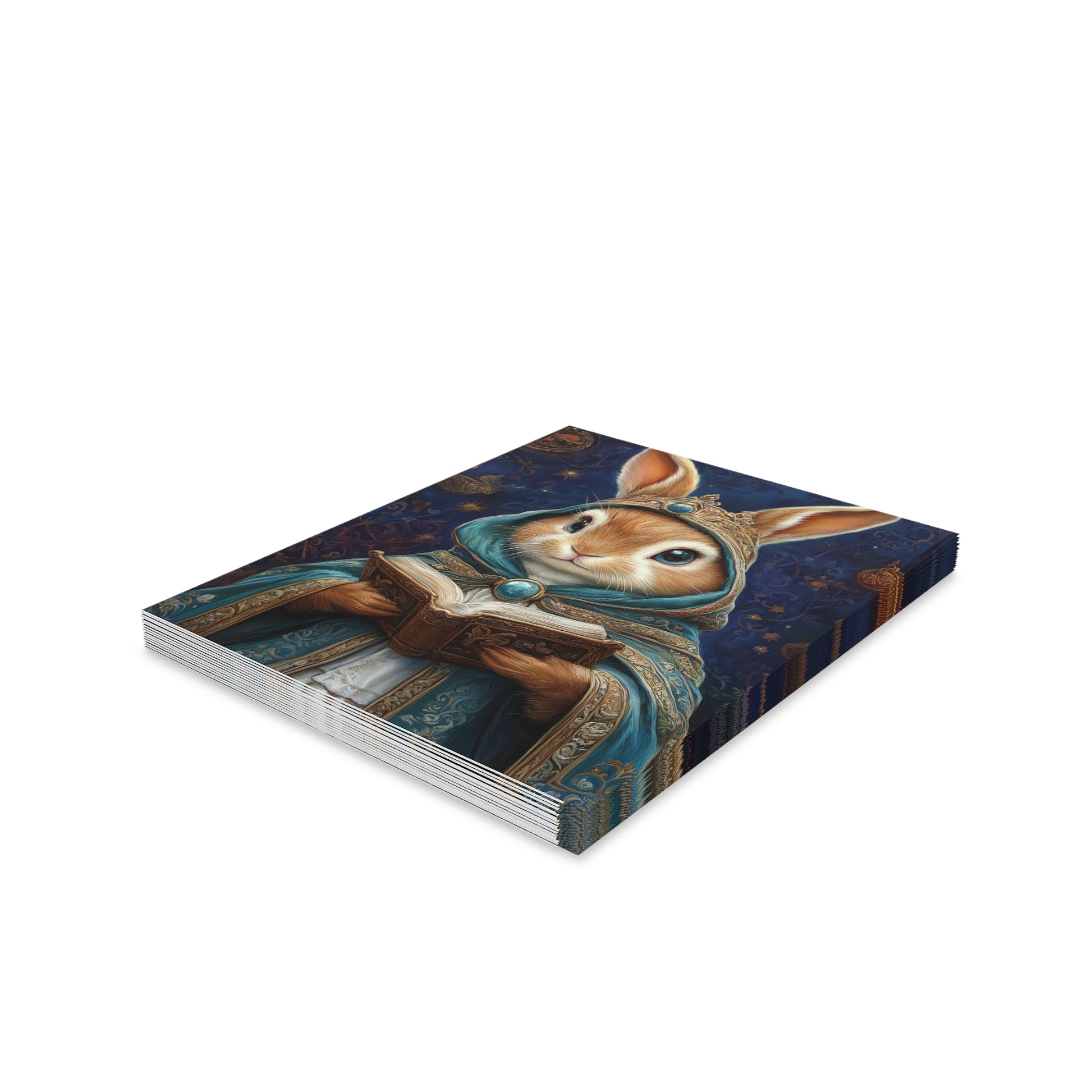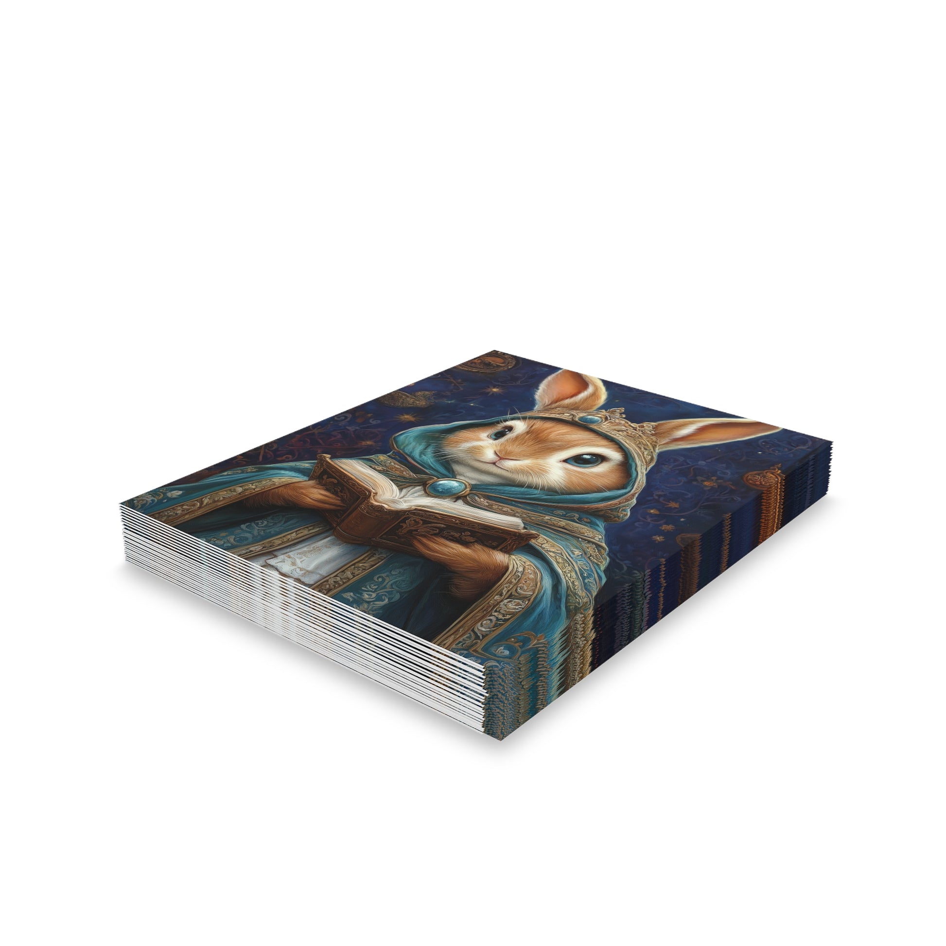 Share a touch of whimsy and wisdom with the Wise Hare's Blessing Greeting Card. Featuring an enchanting illustration of a regal hare adorned in a mystical robe, book in hand, this card evokes the magic of woodland tales and ancient secrets. The delicate details of the hare's attire and the gentle glow of the forest background make this card a perfect way to send a heartfelt message.